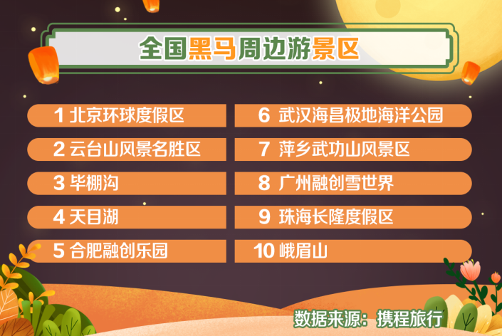 到周边山涧水源处饱览秋日美景成为中秋游玩的一大选择。根据报告,今年中秋期间,周边游门票预订量对比2019年中秋增长近30%。相较2019年中秋,全国黑马周边游景区为:北京环球度假区、云台山风景名胜区、毕棚沟、天目湖、合肥融创乐园、武汉海昌极地海洋公园、萍乡武功山风景区、广州融创雪世界、珠海长隆度假区、峨眉山。