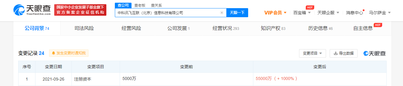 【大河财立方消息】天眼查App显示,近日,科大讯飞关联公司中科讯飞互联(北京)信息科技有限公司发生工商变更,公司注册资本由5000万增加至5.5亿,增幅1000%。
