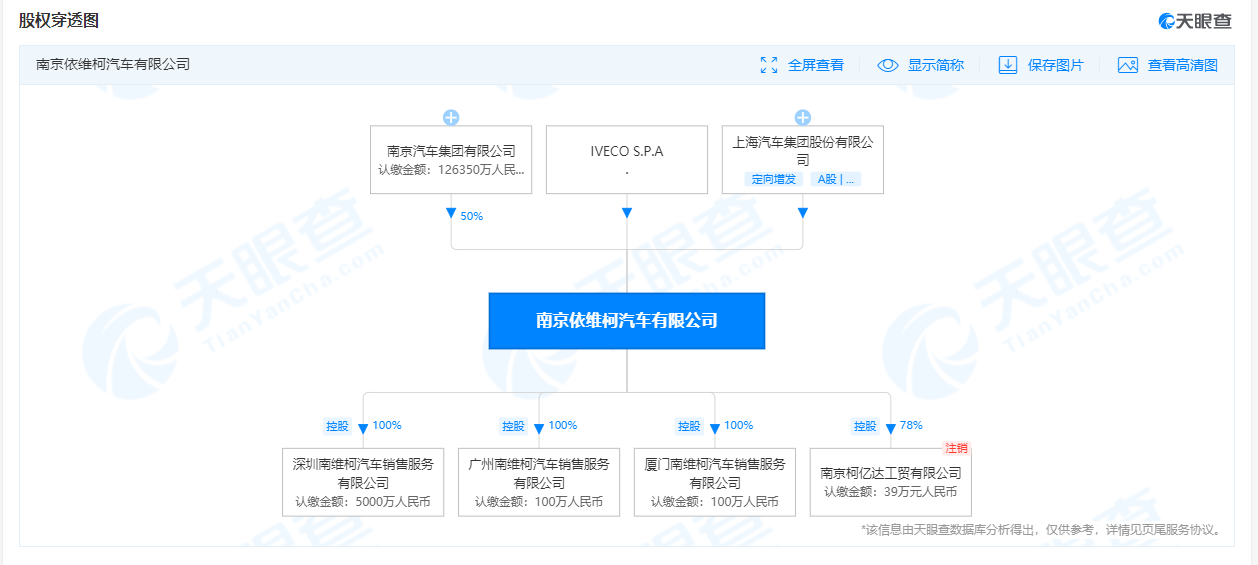 天眼查App显示,南京依维柯汽车有限公司成立于1995年12月,法定代表人为蓝青松,经营范围包括开发、制造商用车辆、乘用车辆、零部件等。据了解,在日前召开的商用车业务媒体沟通会上,上汽集团正式宣布,上汽集团收购南京依维柯汽车有限公司股权已经完成交割。