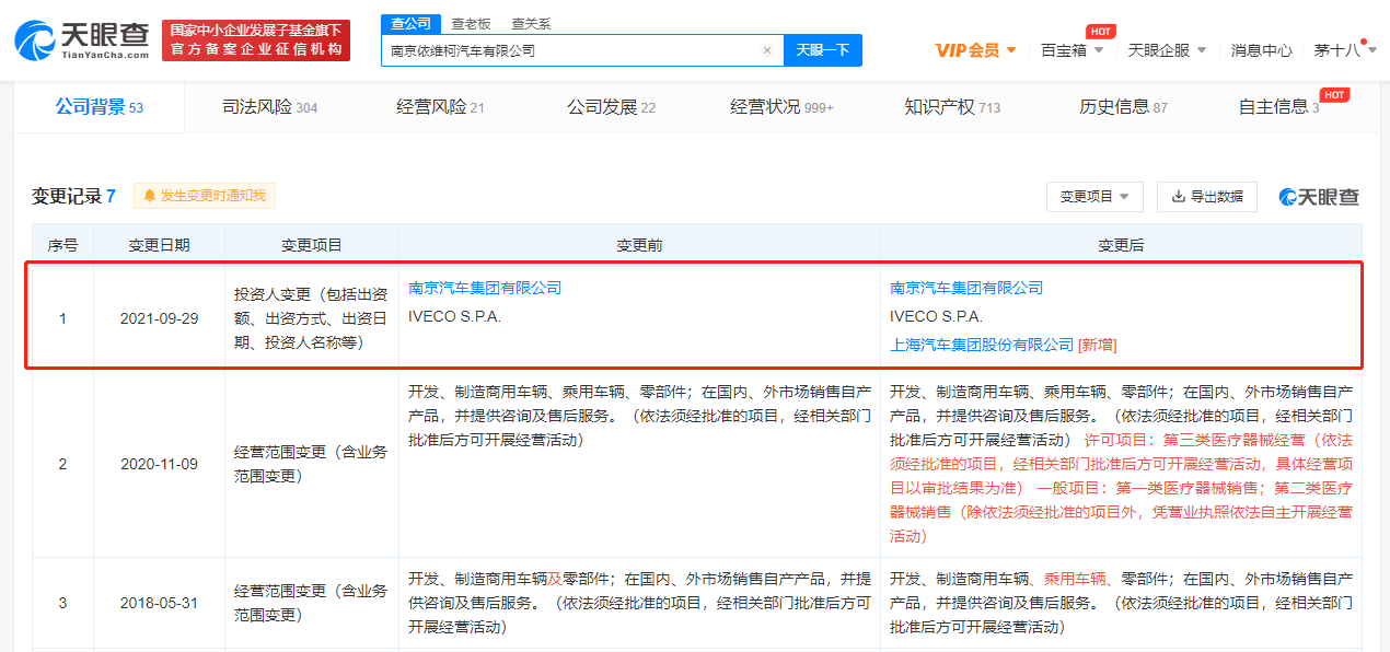 【大河报·大河财立方】(记者 杨霄)近日,南京依维柯汽车有限公司发生工商变更,新增股东上海汽车集团股份有限公司。