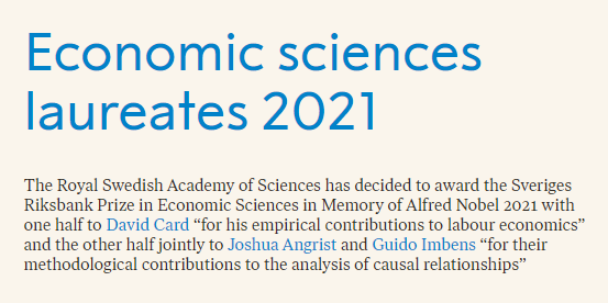 【大河财立方消息】10月11日消息,David Card、Joshua D. Angrist和Guido W. Imbens获得2021年诺贝尔经济学奖,其中一半奖给David Card,“因为他对劳动经济学的实证贡献”,另一半则奖给Joshua D. Angrist和Guido W. Imbens,“因为他们对因果关系分析的方法学的贡献”。