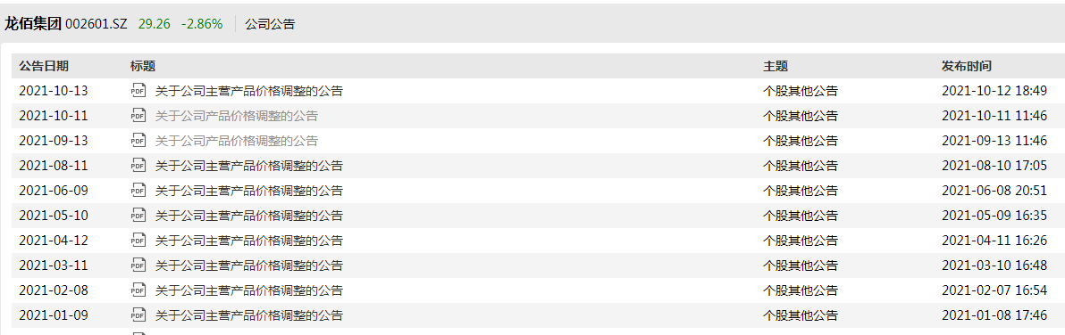 wind数据显示,今年以来,龙佰集团已多次发布主营产品价格调整公告。