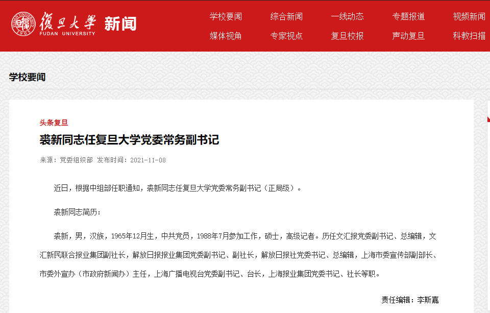 【大河财立方消息】11月8日,据复旦大学官网消息,近日,根据中组部任职通知,裘新同志任复旦大学党委常务副书记(正局级)。
