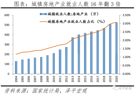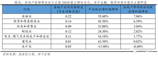 房地产带动解决上下游行业就业,房地产能够带动上下游50多个行业超28%的就业弹性变化,即房地产业经济增加值带来的就业吸纳能力约占三成。房地产业与其他产业存在着很强的关联关系。商品房兼具投资和消费属性,产业链条长。房地产的完全消耗需求带动了商业、建筑等后周期行业,同时也带动了关联产业吸纳人员就业。根据2018年投入产出表,房地产带动的就业弹性系数分别为:金融业7.86%、租赁和商务服务业6.59%、批发和零售3.04%、制造业2.82%、电力煤气及水的生产和供应业1.77%。值得注意的是,房地产业增加值的增长会引起采矿业-0.4%的就业弹性变动,即房地产业的发展会降低该产业的就业。房地产业并非能通过其后向关联关系来拉动全部行业就业。房地产推动城市边缘扩张,可能导致部分原始产业从事者转向其他行业。