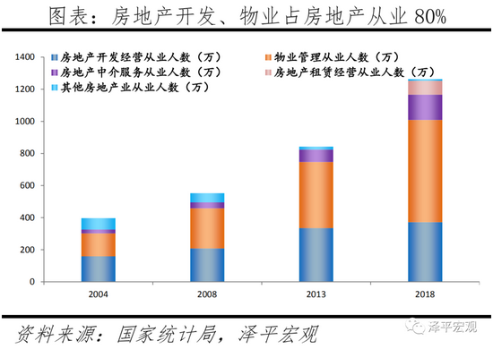 房地产业解决我国实体经济大量就业,2004-2018年我国房地产业从业人数由396万增至1264万,复合增长率8.6%,预估至2021年我国房地产从业人数将达1500万,相较2004年规模扩大三倍。由于我国房地产业的快速发展,更多房地产业公司以及中介公司的产生,为社会提供了大量就业机会。根据我国最新的第四次全国经济普查,2018年房地产业从业人员中,物业管理、房地产开发经营、房地产中介服务、房地产租赁经营从业人员分别占50%、29%、13%、6%,物业与房地产开发从业人数占主流。2004-2018年间房地产中介服务、物业管理、房地产开发经营从业人数规模分别扩大了573%、344%、134%,房地产中介发展最为迅速。从城镇人员就业情况看,2004-2020年城镇人员房地产业就业人数从130万增长至525万人,复合增长率9.12%,远高于城镇就业总人数2.7%的增速。