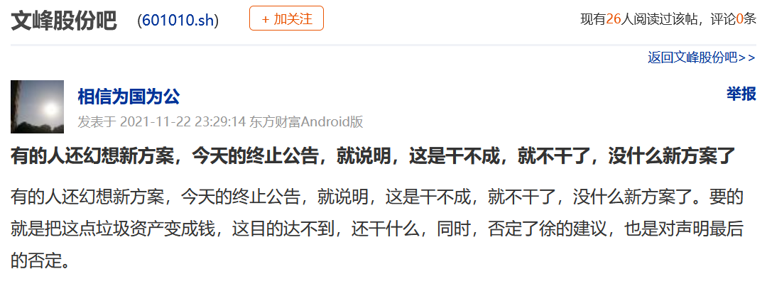 还有投资者在文峰股份股吧中表示:“有的人还幻想新方案,今天的终止公告就说明,这是干不成,就不干了,没有什么新方案了。”