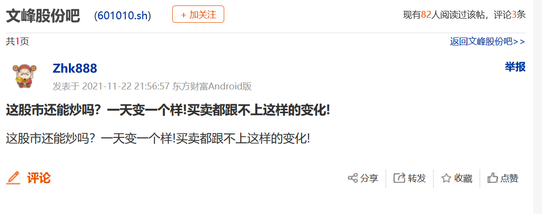 对此,11月22日晚间,有投资者在文峰股份股吧中直呼:“这股市还能炒吗?一天变一个样,买卖都跟不上这样的变化。”