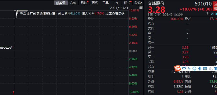11月23日上午,文峰股份终止收购事项得到了资本市场的强烈回应,股票开盘不久后即涨停,报3.28元/股,涨幅达到10.07%。
