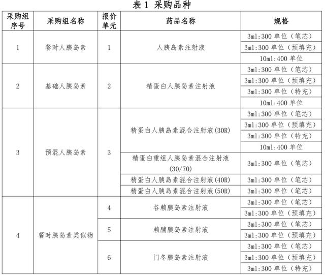 根据上述文件,此次胰岛素集采品种包括餐时人胰岛素、基础人胰岛素、预混人胰岛素、餐时胰岛素类似物、基础胰岛素类似物、预混胰岛素类似物,共6个采购组。各采购组符合申报资格的企业按报价单元进行申报,报价单元共11个。
