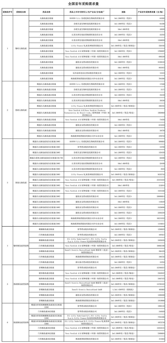 此次集采是第六批国采,瞄准的是糖尿病治疗药物胰岛素。从公开资料来看,这是胰岛素首次进入国采,也是生物药首次进入国采。