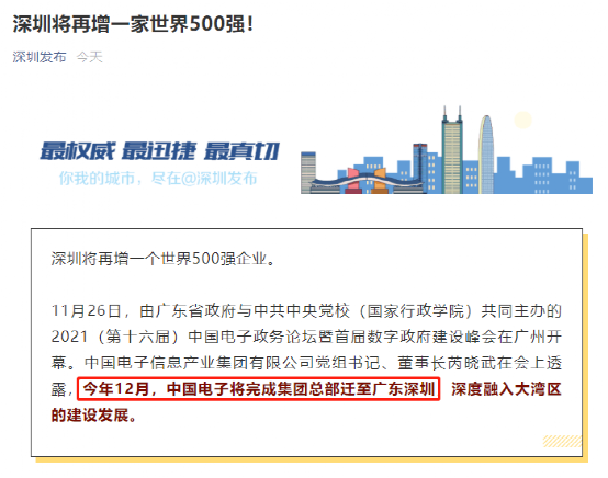 11月26日,由广东省政府与中共中央党校(国家行政学院)共同主办的2021(第十六届)中国电子政务论坛暨首届数字政府建设峰会在广州开幕。据“深圳发布”,中国电子信息产业集团有限公司党组书记、董事长芮晓武在会上透露,今年12月,中国电子将完成集团总部迁至广东深圳,深度融入大湾区的建设发展。