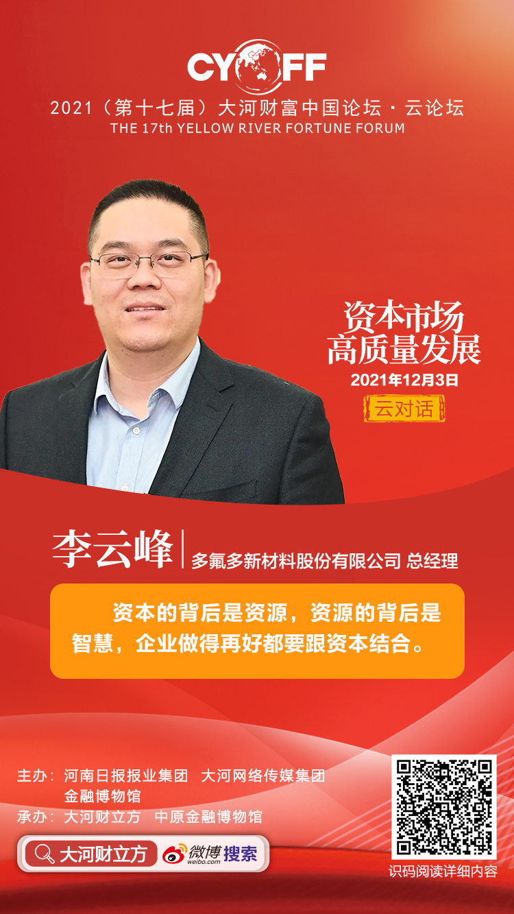 【大河报·大河财立方】(记者 陈诗昂 唐朝金)12月3日上午,2021(第十七届)大河财富中国论坛第四场活动——“资本市场高质量发展”云端论坛启幕。多氟多新材料股份有限公司(以下称多氟多)总经理李云峰结合企业发展历程,从企业视角分享了他对当前河南资本市场的一些看法。