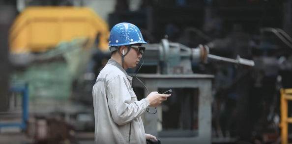 在济源钢铁轧钢生产车间,工人通过佩戴AR眼镜,实现了与国外专家的沟通交流。