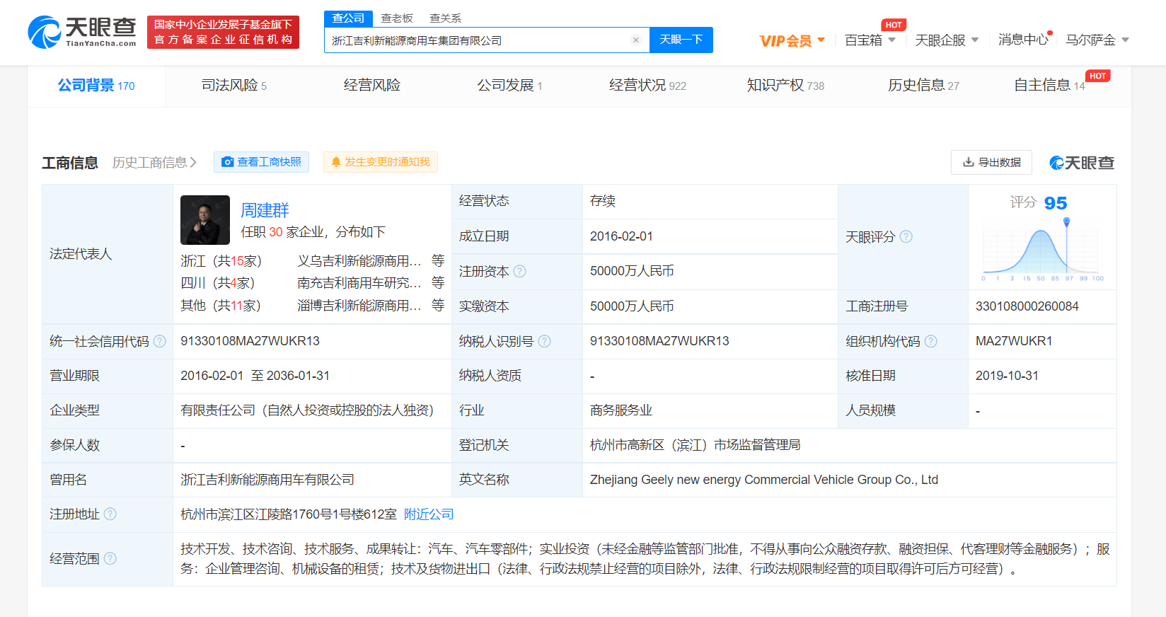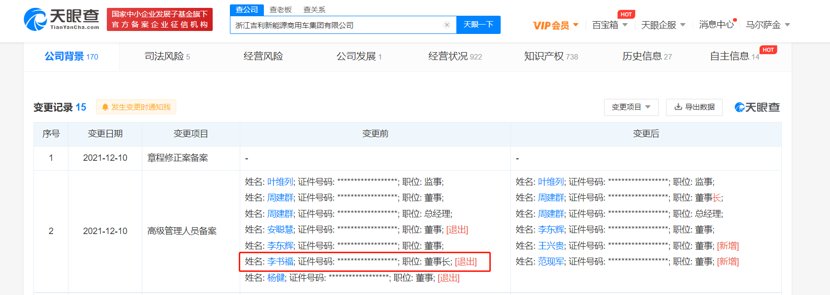 【大河财立方消息】12月13日,据天眼查App显示,近日,浙江吉利新能源商用车集团有限公司发生工商变更,李书福退出董事长职位,总经理周建群兼任董事长。