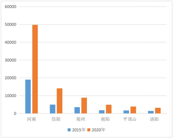 全省涉茶企业按照注册数量排名,2000家以上的地市依次为:信阳14086家、郑州8882家、南阳4941家、平顶山3906家、洛阳3220家、周口2392家、商丘2116家。