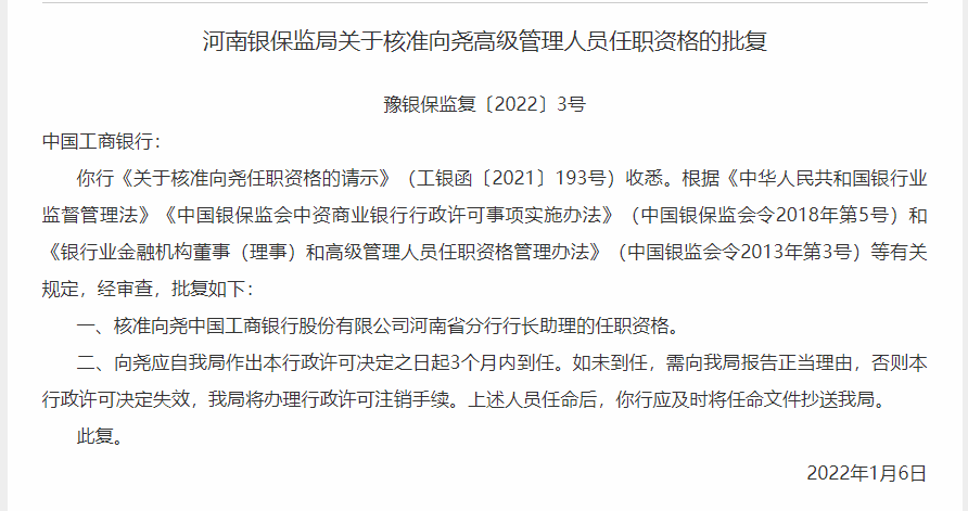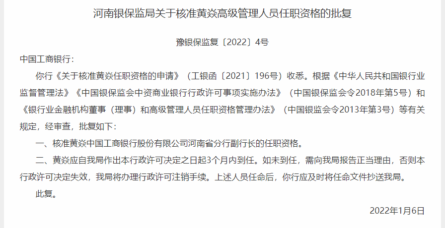 【大河财立方消息】1月12日,河南银保监局批复工商银行河南省分行两名高管任职资格,核准黄焱工商银行河南省分行副行长的任职资格,核准向尧行长助理的任职资格。