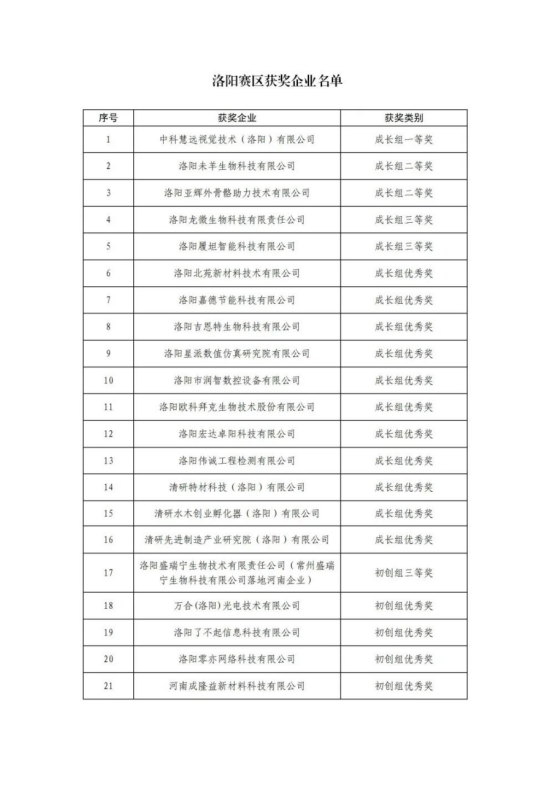 【大河报·大河财立方】(记者 张劭辉 通讯员 张炜 文图)记者17日从洛阳市科技局获悉,近日,河南省科技厅公布了第十届中国创新创业大赛河南赛区暨第十三届河南省创新创业大赛获奖企业(项目)及优秀组织奖名单,洛阳赛区24家企业获奖,连续两年获奖数量居全省第一位。