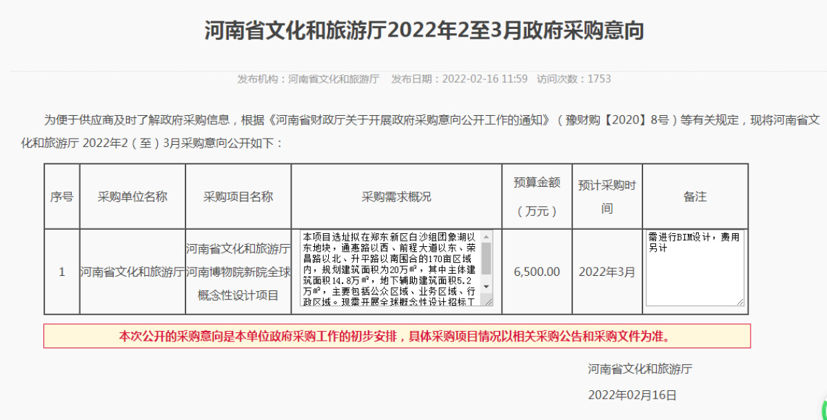 根据了解,此番公布政府采购意向,是为了便于供应商及时了解政府采购信息。其中,开展河南博物院新院全球概念性设计招标工作,预算金额6500万,预计采购时间2022年3月。