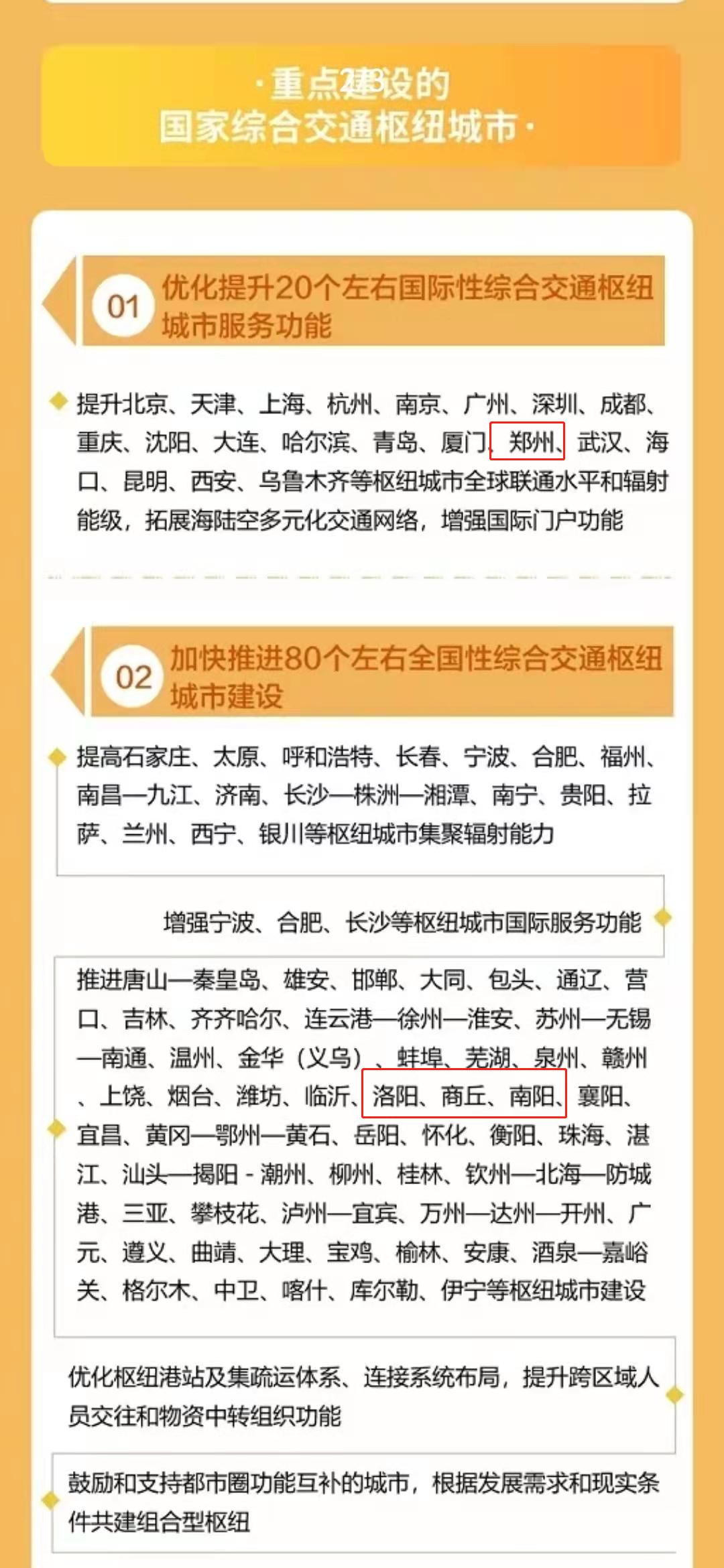 其中,郑州入选国际性综合交通枢纽城市名单,洛阳、商丘、南阳入选全国性综合交通枢纽城市建设名单。