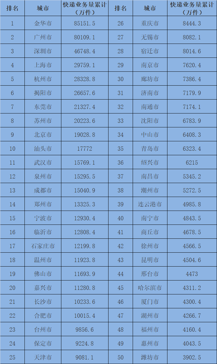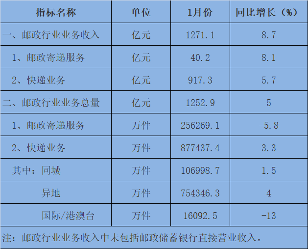 【大河报·大河财立方】(记者 丁洋涛)2月17日,国家邮政局公布2022年1月邮政行业运行情况。1月份,全国快递服务企业业务量完成87.7亿件,同比增长3.3%;业务收入完成917.3亿元,同比增长5.7%。记者发现,在快递业务量城市榜50强中,河南郑州、商丘上榜,分别为第14名和第41名。