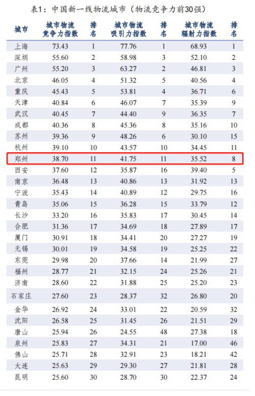 综合竞争力居第一梯队,郑州物流辐射力水平全国第8