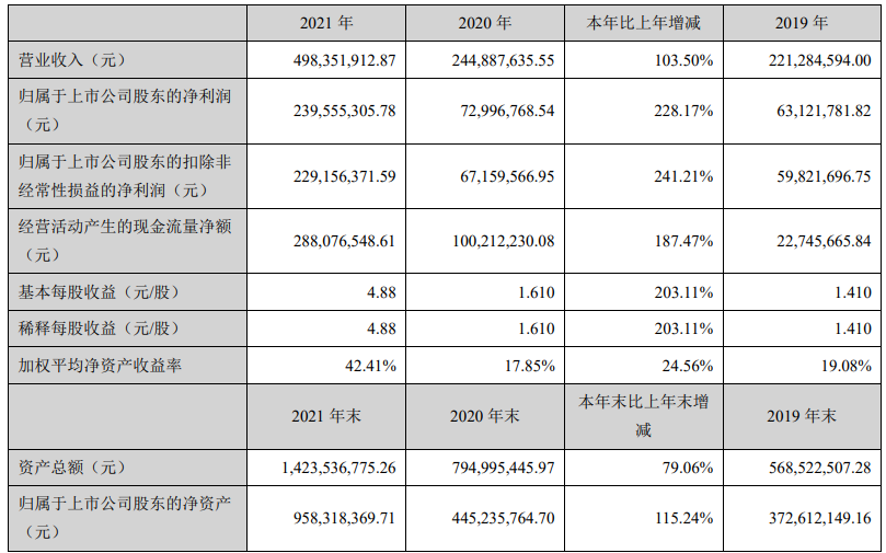 2月27日晚间,力量钻石发布2021年年度报告,2021年营业收入约4.98亿元,同比增加103.5%;归属于上市公司股东的净利润约2.4亿元,同比增加228.17%;基本每股收益盈利4.88元,同比增加203.11%。