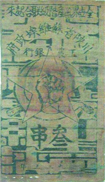 4.宣传政治主张。货币作为一种流通品,在苏区也常常作为宣传的载体。川陕省工农银行发行的苏币上,无论何种面额、版式,尽皆印刷或镌写中国共产党人的政治主张。如在壹元纸币、布币、三串纸币上印有“政权归苏维埃,土地归农民”字样;在二串、三串、五串、十串布币、一元纸币上有“增加工农生产,发展社会经济”字样;在三串纸币上有“坚决保卫苏区”字样;在小200文铜币上有“赤化全川”字样。除此之外,所有川陕苏币上皆有“全世界无产阶级联合起来”字样。在不同面额、不同版式的苏币上还分别绘制或镌刻铁锤镰刀交叉的党徽、表示工农联盟的齿轮与麦穗,以及马克思、列宁等无产阶级革命家的头像。