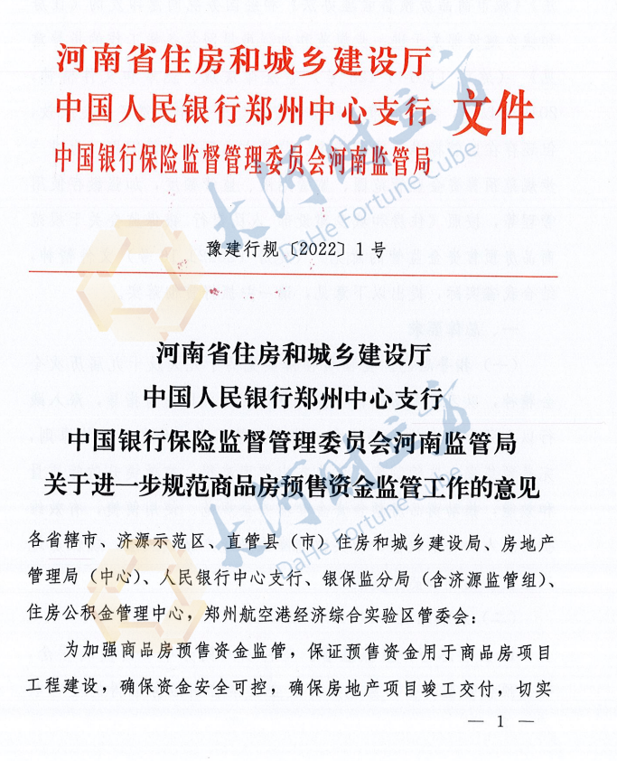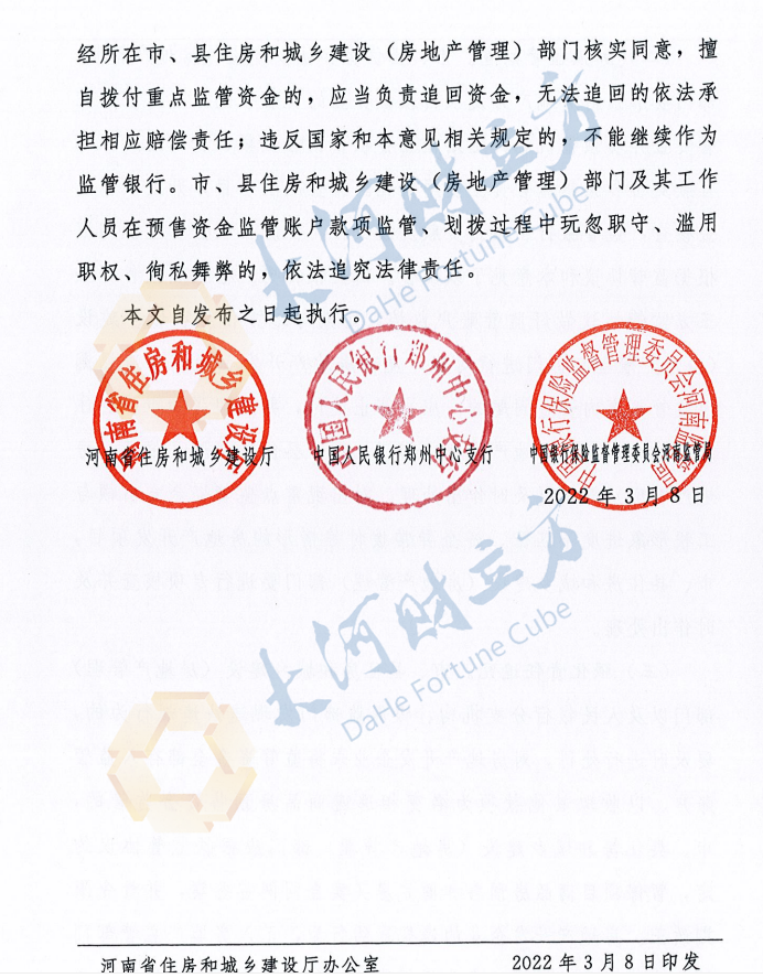 【大河财立方消息】3月11日,河南省住房和城乡建设厅、中国人民银行郑州中心支行、中国银行保险监督管理委员会河南监管局联合发布《关于进一步规范商品房预售资金监管工作的意见》(简称《意见》)。