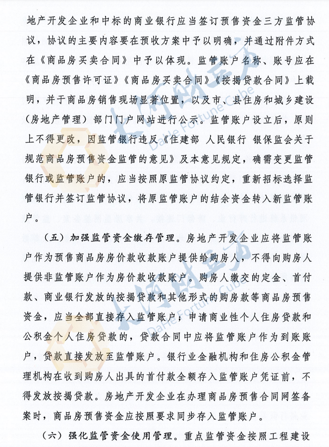 另外,《意见》指出,市、具住房和城乡建设(房地产管理)部门应制定商品房预售资金监管协议(以下简称“监管协议”)文本,明确各方权利、义务和责任,明确当地重点监管资金额度核定办法、监管方式、拨付流程以及违约责任等。房地产开发企业按照一次预售许可申请对应一个账户的原则开设监管账户。