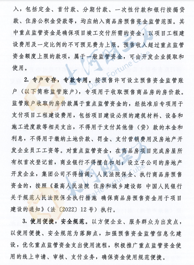 其中重点监管资金是确保项目竣工交付所需的资金,以项目工程建设费用及一定比例的不可预见费为上限。预售收入超过重点监管资金额度上限的款项,属于一般监管资金,可由开发企业提取和使用。