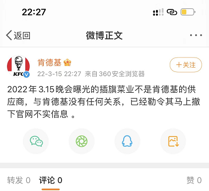 【大河报·大河财立方】(记者 吴海舒)针对插旗菜业被央视315晚会曝光卫生不达标、制作过程无保障等问题,肯德基在官方微博回应:“2022年3.15晚会曝光的插旗菜业不是肯德基的供应商,与肯德基没有任何关系,已经勒令其马上撤下官网不实信息。”
