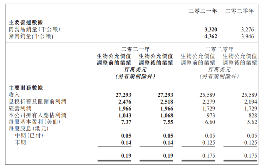 【大河财立方消息】3月28日,万洲国际发布2021年年报。数据显示,2021年营业收入272.93亿美元,上升6.7%,经营利润19.66亿美元,上升13.7%,本公司拥有人应占利润(生物公允价值调整前)10.43亿美元,上升7.2%。