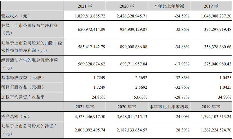 【大河财立方消息】3月29日,华兰疫苗发布2021年年度报告,2021年营业收入约18.3亿元,同比减少24.59%;归属于上市公司股东的净利润盈利约6.21亿元,同比减少32.86%;基本每股收益盈利1.7249元,同比减少32.86%。