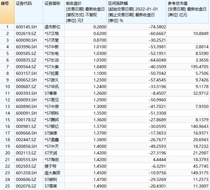 截至3月30日,股价低于1.5元的股票共有25家。除*ST艾格、*ST济堂低于1元以外,*ST中新、*ST东电、*ST长动、*ST大集、*ST拉夏等公司的股价在1元~1.1元之间。