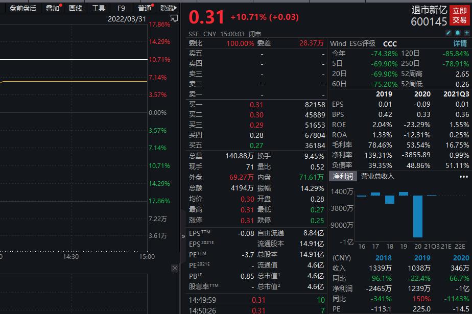 3月31日,退市新亿盘中快速回调,5分钟内跌幅超过2%,截至9点39分,报0.29元,成交854.68万元,换手率2.00%。截至3月31日收盘,退市新亿上涨10.71%,成交4194万元,换手率9.45%,报收于0.31元/股,每股上涨3分钱。