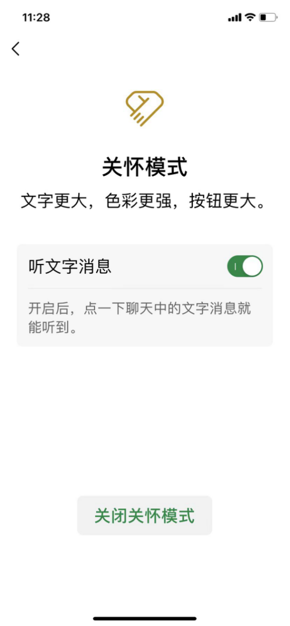 在关怀模式下,用户可开启听文字功能,点击聊天中的文字消息即可听到语音朗读,可帮助长辈们或有视力障碍的用户更方便地使用微信。