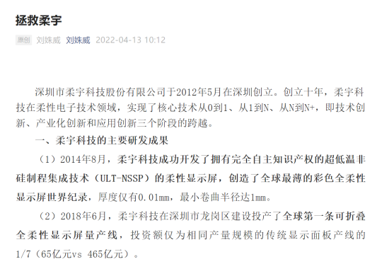 刘姝威在文章最后提出:“拯救柔宇,保持我国在柔性技术领域的国际领先水平。”