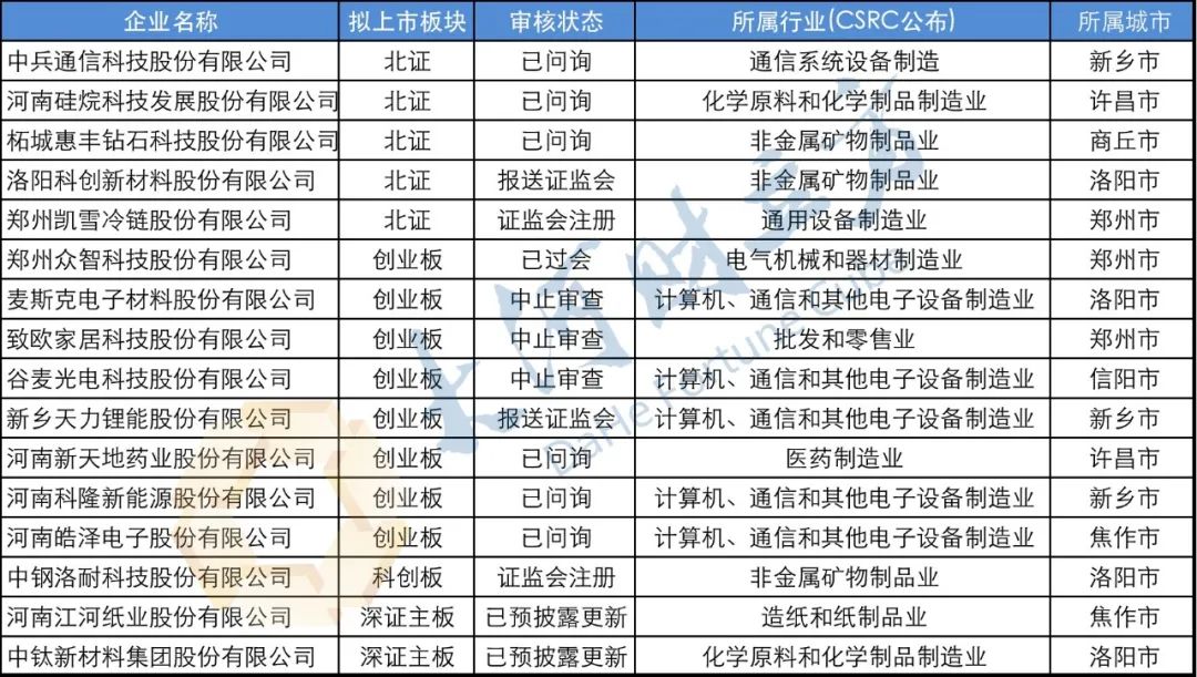 截至目前,河南共有17家企业正在上市审核中,其中申请深证主板上市企业2家、创业板9家、北交所5家、科创板1家。