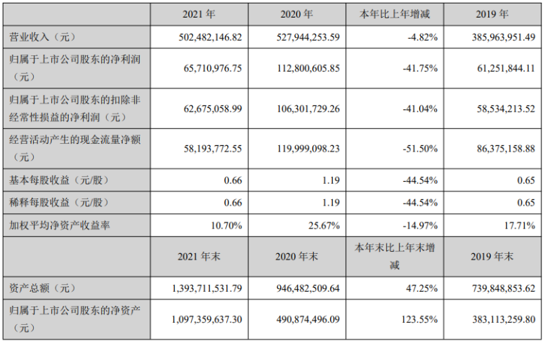2021年,拓新药业实现营业收入约5.02亿元,同比下降4.82%,净利润约6571万元,同比下降41.75%。2022年一季度,该公司实现营业收入约1.3亿元,同比下降10.22%,净利润约2844万元,同比下降5.57%。