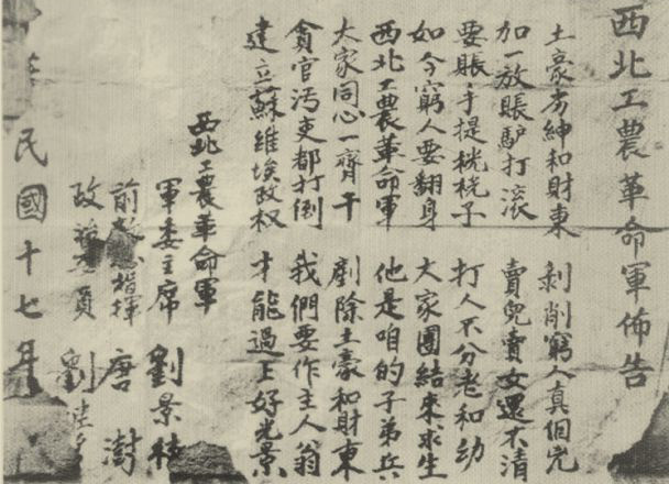 1928年5月,刘志丹等人组织渭华起义,成立西北工农革命军。图为西北工农革命军布告