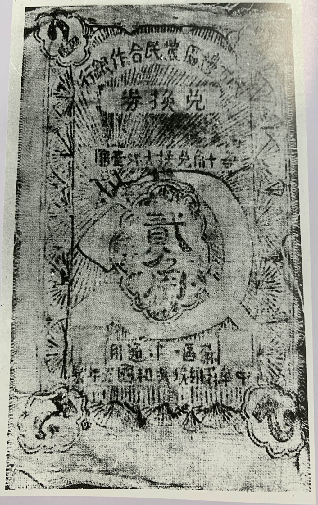 陕甘边区农民合作银行。1934年11月,因边区政治、经济的发展需要,成立后不久的陕甘边区苏维埃政府决定成立陕甘边区农民合作银行,发行新的苏区货币——“陕甘边区农民合作银行兑换券”,简称“农民券”,同时停止发行“油布币”。“农民券”是陕甘边区政府发行的第二种货币。