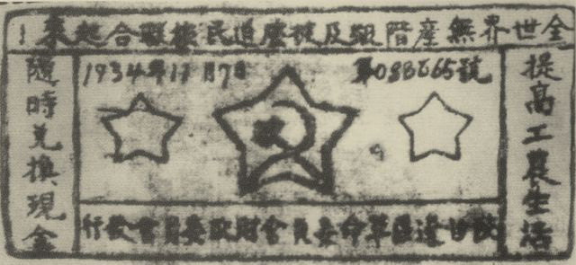 陕甘省苏维埃银行。1935年4月,国民党政府调集陕、甘、宁、豫、晋、绥6省7个师计5万多兵力,向陕甘边区和陕北根据地发动第二次“围剿”,企图将新生的革命政权扼杀在摇篮中。陕甘边区苏维埃政府随即撤离南梁地区,迁至甘泉下寺湾,停发“农民券”,并把陕甘边区农民合作银行改称为“陕甘省苏维埃银行”,开始印发“银币券”纸币、布币和“铜币券”纸币。“银币券”发行过1角、5角、1元三种面额;“铜币券”发行过20枚一种。“银币券”正面上方为“陕甘省苏维埃银行”的行名,中央为镰刀锤头图案,正下方还印有“中华苏维埃共和国五年印制”,背面印有“凭票即付”和“中华苏维埃共和国五年印制”文字。