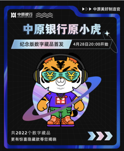 【大河报·大河财立方】(记者 陈玉静)4月28日,中原银行重磅推出纪念版数字藏品——中原银行原小虎,在虎年生肖形象的基础上,中原银行融入中原地区传统文化和旅游元素,推出2022个独具地方特色的数字藏品。