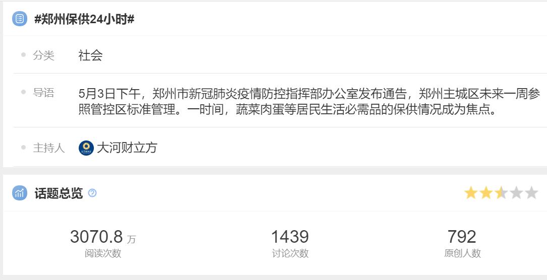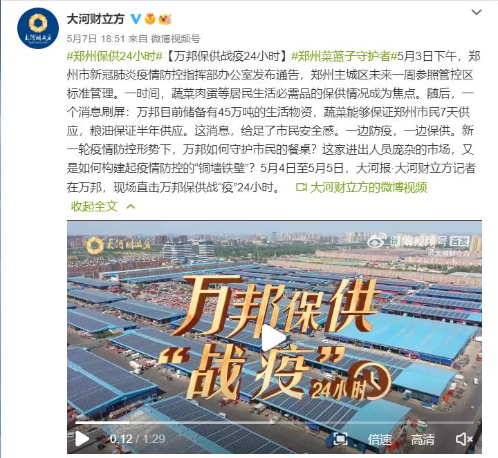 5月7日晚,大河财立方推出《万邦保供战疫24小时》报道,记录了在这场来势汹汹的疫情中,万邦是如何守护人们菜篮子的。随后,微博话题#郑州保供24小时#登上全国热搜,并位居同城热搜第一位,阅读量超3000万,近1500人留言。