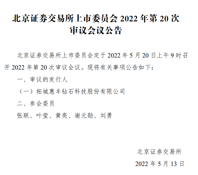 【大河财立方消息】5月13日,北交所公告称,北交所上市委员会定于2022年5月20日上午9时召开2022年第20次审议会议,审议的发行人为柘城惠丰钻石科技股份有限公司。