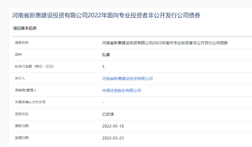 【大河财立方消息】5月18日,据上交所公司债券项目信息平台,河南省新惠建设投资有限公司2022年面向专业投资者非公开发行公司债券获上交所反馈。