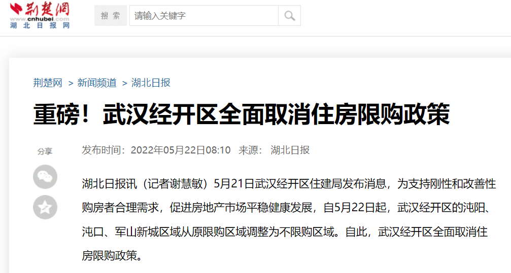 5月22日,据湖北日报讯,湖北省武汉市经开区全面取消住房限购政策。