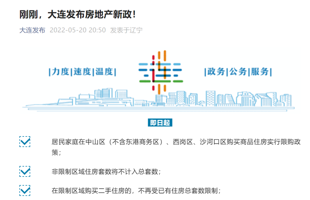 5月20日,“大连发布”公众号发文称,大连市保持房地产市场平稳健康发展工作领导小组办公室发布《关于促进我市房地产业健康发展和良性循环的通知》(以下简称《通知》)。