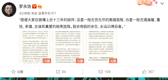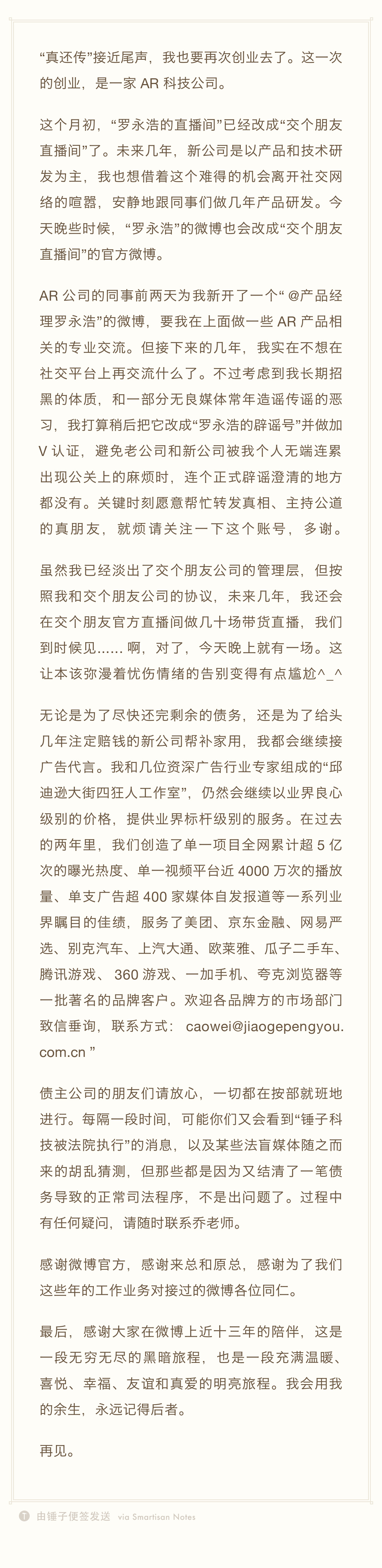 罗永浩在微博表示,微博账号“@罗永浩”不会注销,而是将改名为“@交个朋友直播间”,同时,罗永浩创业公司的同事已注册新的微博账号“@产品经理罗永浩”,用于交流专业问题。不过,罗永浩准备把它改成“罗永浩的辟谣号”,并加V认证。此外,未来几年,罗永浩仍会继续在抖音带货。