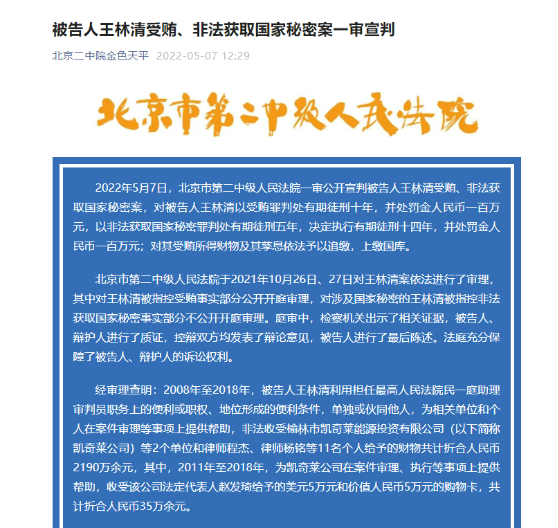 2022年6月20日,北京市高级人民法院对上诉人王林清受贿、非法获取国家秘密上诉一案依法公开宣判,驳回其上诉,维持原判。